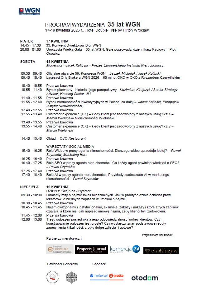 Kulminacyjnym punktem pierwszego dnia będzie uroczysta Wielka Gala z okazji 35-lecia WGN, podczas której zostaną wręczone statuetki Orła Brokera WGN 2026 w pięciu kategoriach. Galę poprowadzi znany dziennikarz radiowy Piotr Osowicz.