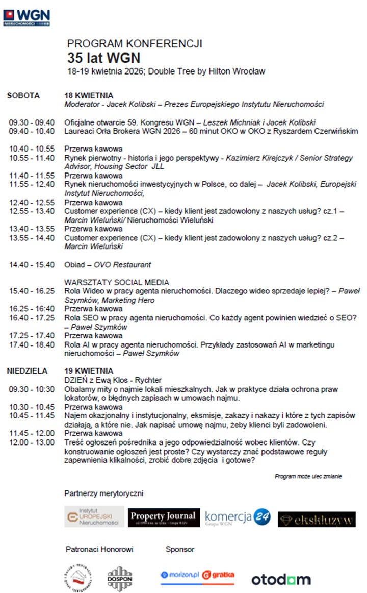 Wydarzenie odbywa się pod honorowymi patronatami Polskiej Federacji Rynku Nieruchomości (PFRN) oraz Dolnośląskiego Stowarzyszenia Pośredników w Obrocie Nieruchomościami (DOSPON) a także przy wsparciu partnerów branżowych: Morizon-Gratka Group, Otodom.