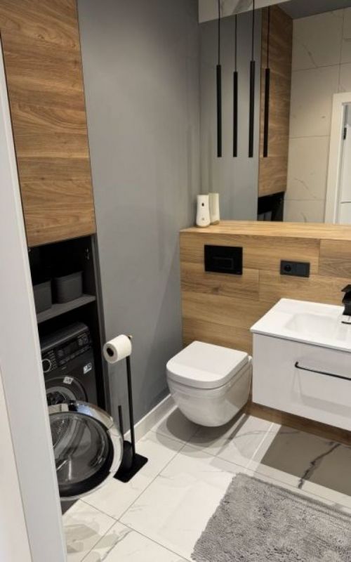 - Kuchnia premium: zabudowa z mebli Rehau, okucia Blum, sprzęt Bosch (w tym piekarnik parowy)