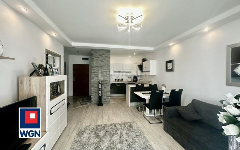 Mieszkanie składa się z: przestronnego, jasnego, salonu połączonego z nowocześnie wyposażonym aneksem kuchennym oraz z wyjściem na balkon typu loggia, tarasu, pięknie urządzonej sypialni, łazienki oraz korytarza o powierzchni użytkowej 47,27 m2.