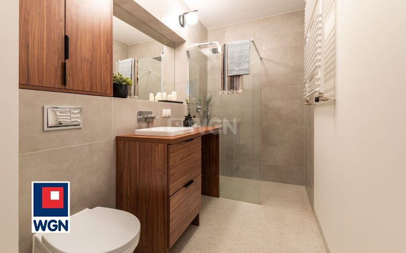 Łazienka z WC o wielkości ok 5 m2, a w niej wygodny prysznic typu walk-in.