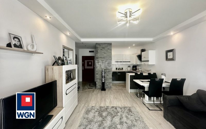 Mieszkanie składa się z: przestronnego, jasnego, salonu połączonego z nowocześnie wyposażonym aneksem kuchennym oraz z wyjściem na balkon typu loggia, tarasu, pięknie urządzonej sypialni, łazienki oraz korytarza o powierzchni użytkowej 47,27 m2.